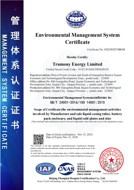 এই সার্টিফিকেশনগুলি উচ্চ-কার্যকারিতা, সামঞ্জস্যপূর্ণ তরল শীতল সমাধান (তরল শীতল প্লেট, শীতল টিউব,এবং ব্যাটারি প্যাকের নিচের কোষ) ইভি জন্য, ESS, এবং অন্যান্য অ্যাপ্লিকেশন